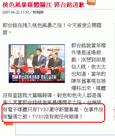 自從TVBS發生錄影代事件後,對報導一些報料性的新聞上可能會有所警慎,剛剛在Yahoo及PChome的新聞看到兩則有關郭台銘的報導,都特別加註說明”只有TVBS嚴守新聞專業“,真的有點矯枉過正的,沒必要這樣的強調吧!