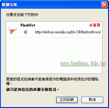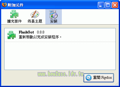 首先要安裝FlashGot這一個附加元件,直接在FireFox點選這一個連結就會開始安裝