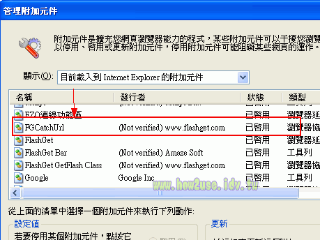 2.安裝完後,你可以到IE的【工具】→【管理附加元件】查看是否有FGCatchUrl這一項,這一項是可以讓你點選BDG空間下載的按鈕後,會自動啟動FlashGet來下載