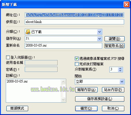 5.要下載速度增加,要將【分割檔案為】這一項的分割數設成10個,在一開始十個分割點都會下載這時的速度以8M的ADSL下載都能在600~500KB/s左右的速度下載,但只能夠維持約1分鐘,接著就只能維持一個分割點下載,不過這樣已經很足夠了,因為一分鐘x600KB/s=36MB,BDG單檔約100MB在前一分鐘就可下載到四分之一的檔案,接著就單點快的話1百多KB下載,一個100MB的檔案約6~8分鐘就可下載完了,大約可節省掉約4~5分鐘的時間。