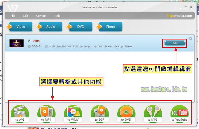 2.加入影片後,如要對影片剪輯或是旋轉點選【Edit】進入編輯視窗。