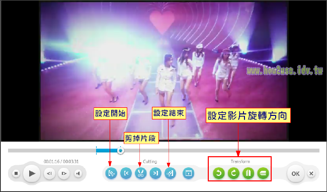 再點選【Edit】進入的編輯視窗可以將影片不要的片段剪掉,及將影片左右旋轉或是垂直水平轉向,這對拍攝影片轉正相當方便。