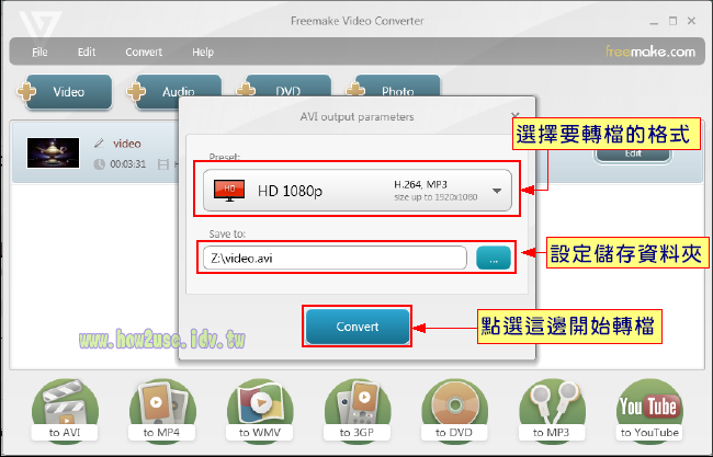 3.點選下方要轉檔的格式後會出現設定影片品質選項,選定後點選【Convert】開始轉檔。