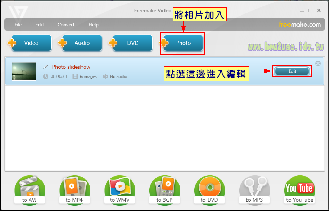 4.在相片幻燈片(Photo Slideshow)製做:先將相片加入後點選【Edit】進入編輯