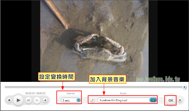 進入編輯畫面後,可以設定相片變換時間及加入背景音樂,設定好後點選【OK】。接著在主程式選擇要轉檔的格式,就可以將相片製作成影片的幻燈片。