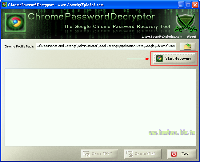 1.解壓縮檔案後,直接執行ChromePasswordDecryptor.exe檔,點選【Start Recovery】會開始搜尋存在Google Chrome內的帳號密碼。