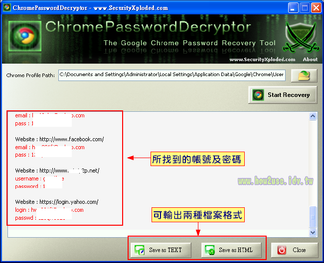 2.會列出在Google Chrome內所儲存的網站上的帳號及密碼,可以將這些資料輸出儲存成TXT文件檔或是HTML網頁檔。