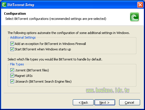 1.安裝時會出現基本的設定,建議可都勾選起來,如果不想開機就啟動可以將【Start BitTorrent when windows starts up】這一欄不勾選。