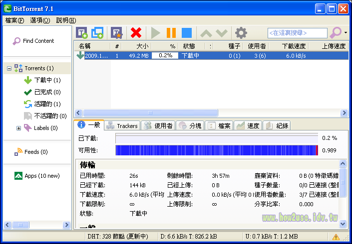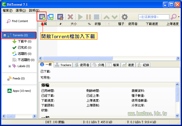 4.在下載介面已與先前的6.1版本佈景有點變更。要下載在安裝時如果已設定Torrent檔案關聯就可直接點選開啟加入下載,也可以點選軟體開啟Torrent檔加入下載。