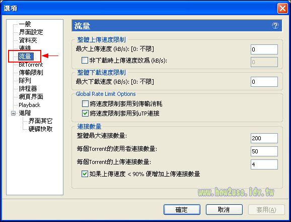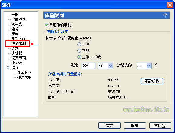 【傳輸限制】:這邊可以設定當上傳或是下載達到設定的大小時停止傳輸。這一個應該是之前版本所沒有的功能。