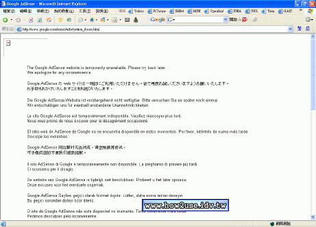 無法瀏覽會跳到http://www.google.com/errors/asfe/system_down.html 顯示21種文字,說明”Google AdSense 網站暫時無法流覽。請您侍候再嘗試。對於造成您的不便我們感到抱歉。 “